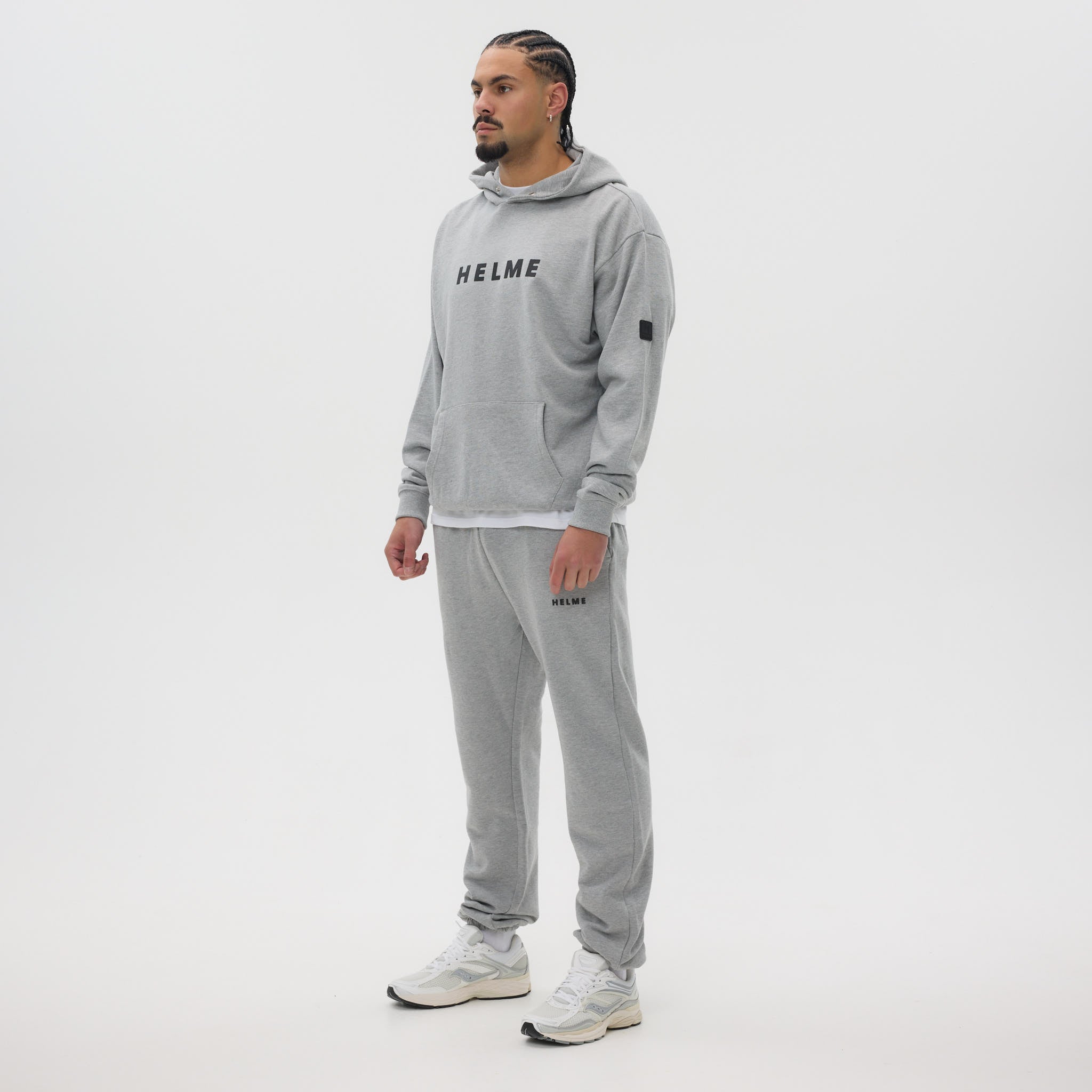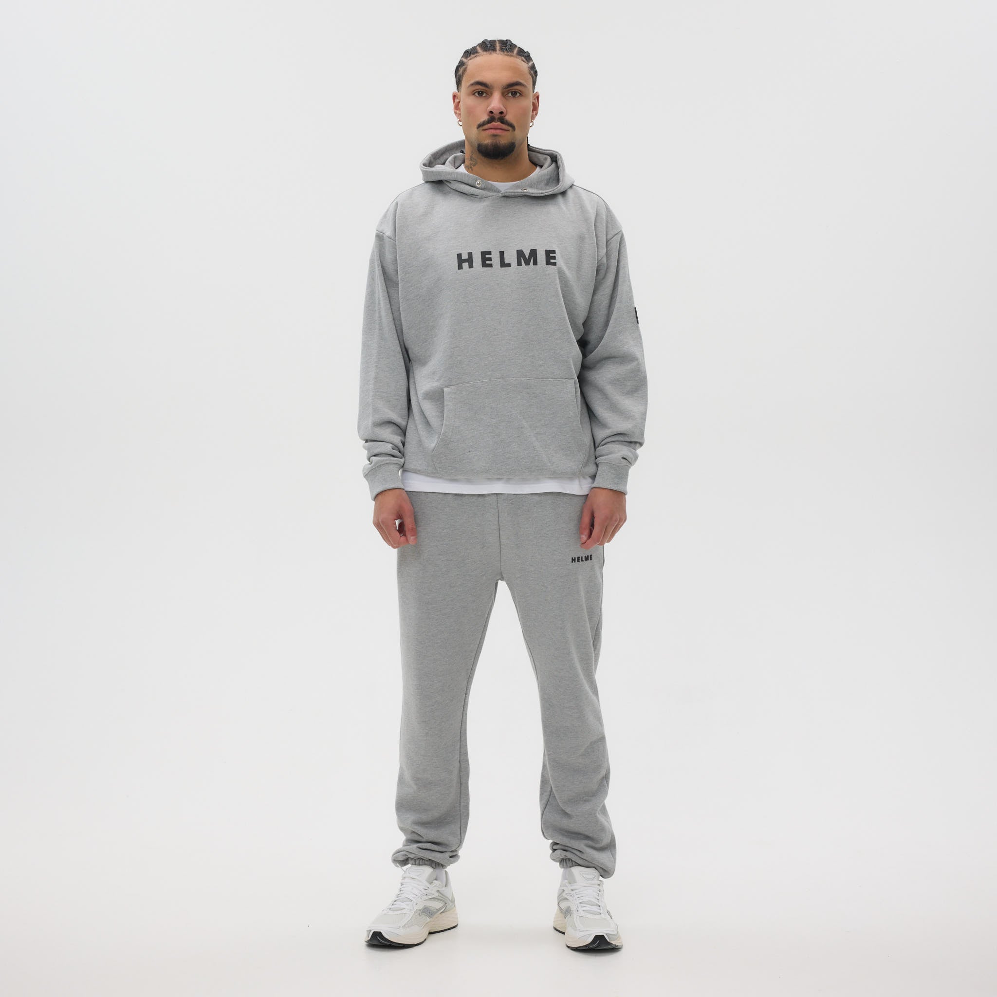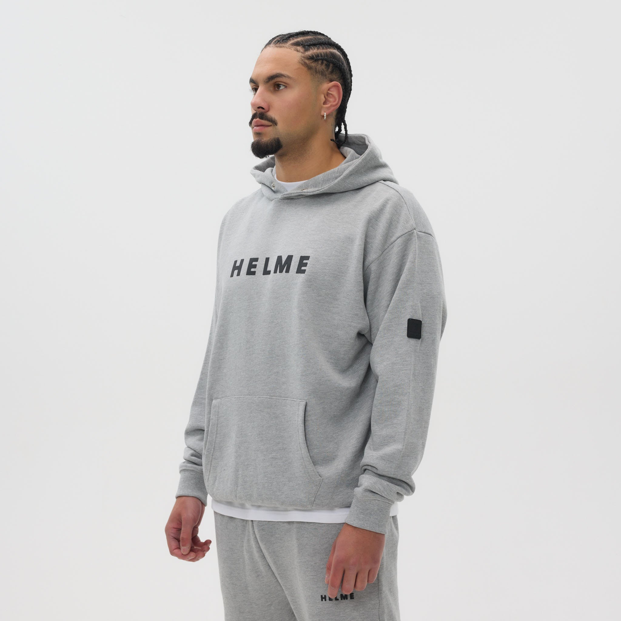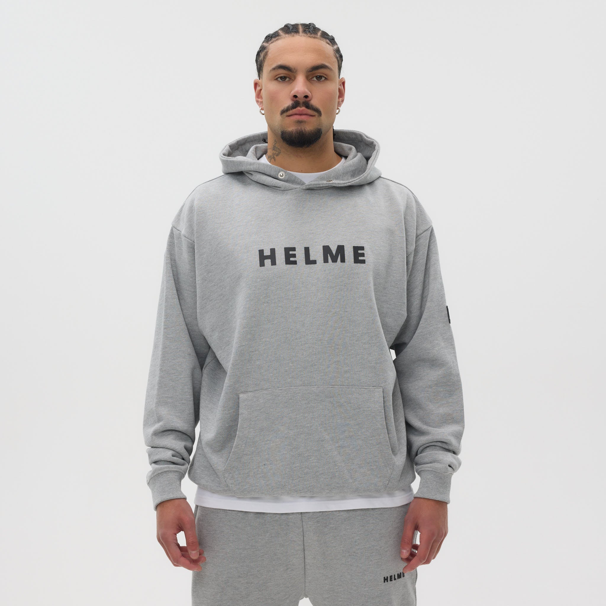 The Helme Heavyweight Hoodie is crafted for comfort and durability, cut from a substantial 450 GSM fabric for a structured yet relaxed feel. Designed in an oversized fit, it combines a clean aesthetic with standout Helme detailing, including a bold rubber chest print and a tonal rubber badge on the sleeve. A button popper closure at the hood adds a functional touch, while ribbed cuffs and hem provide shape and structure. Available in Black, Navy, Charcoal, and Grey.