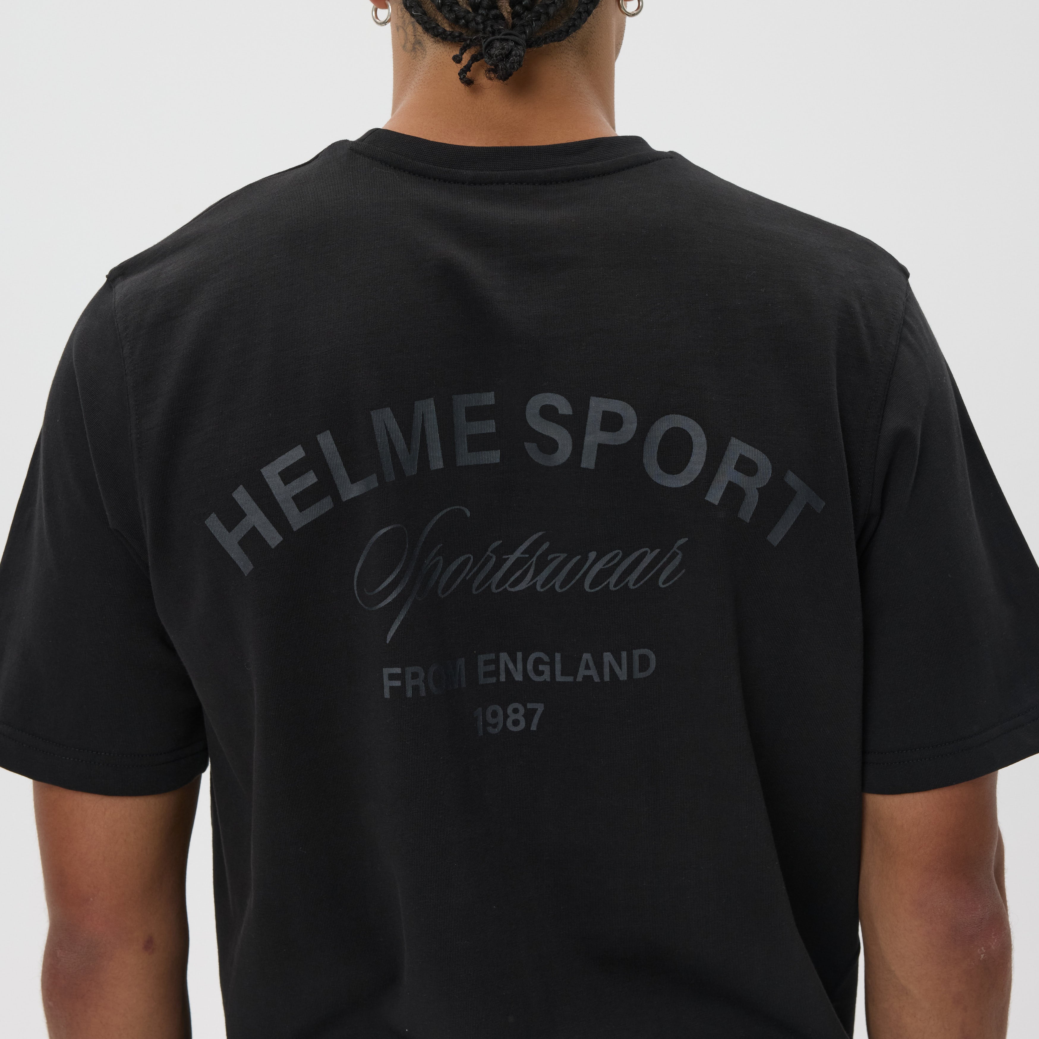 Minimal Helme branding is printed on the chest, while the back showcases a bold “Helme Sport Sportswear From England 1987” graphic, adding a statement finish rooted in heritage design. A ribbed neckline ensures shape retention, while the heavyweight cotton construction gives durability and a premium touch.