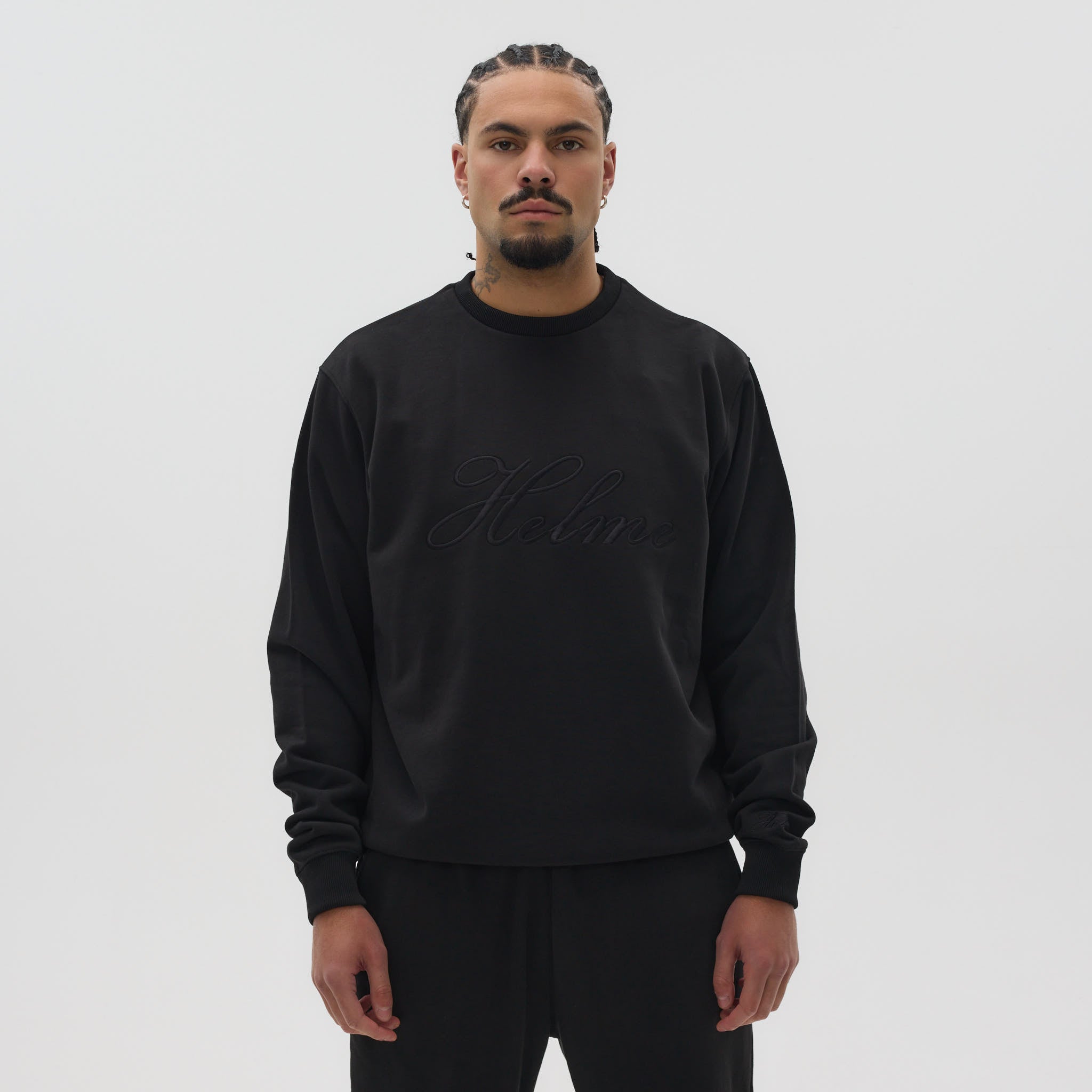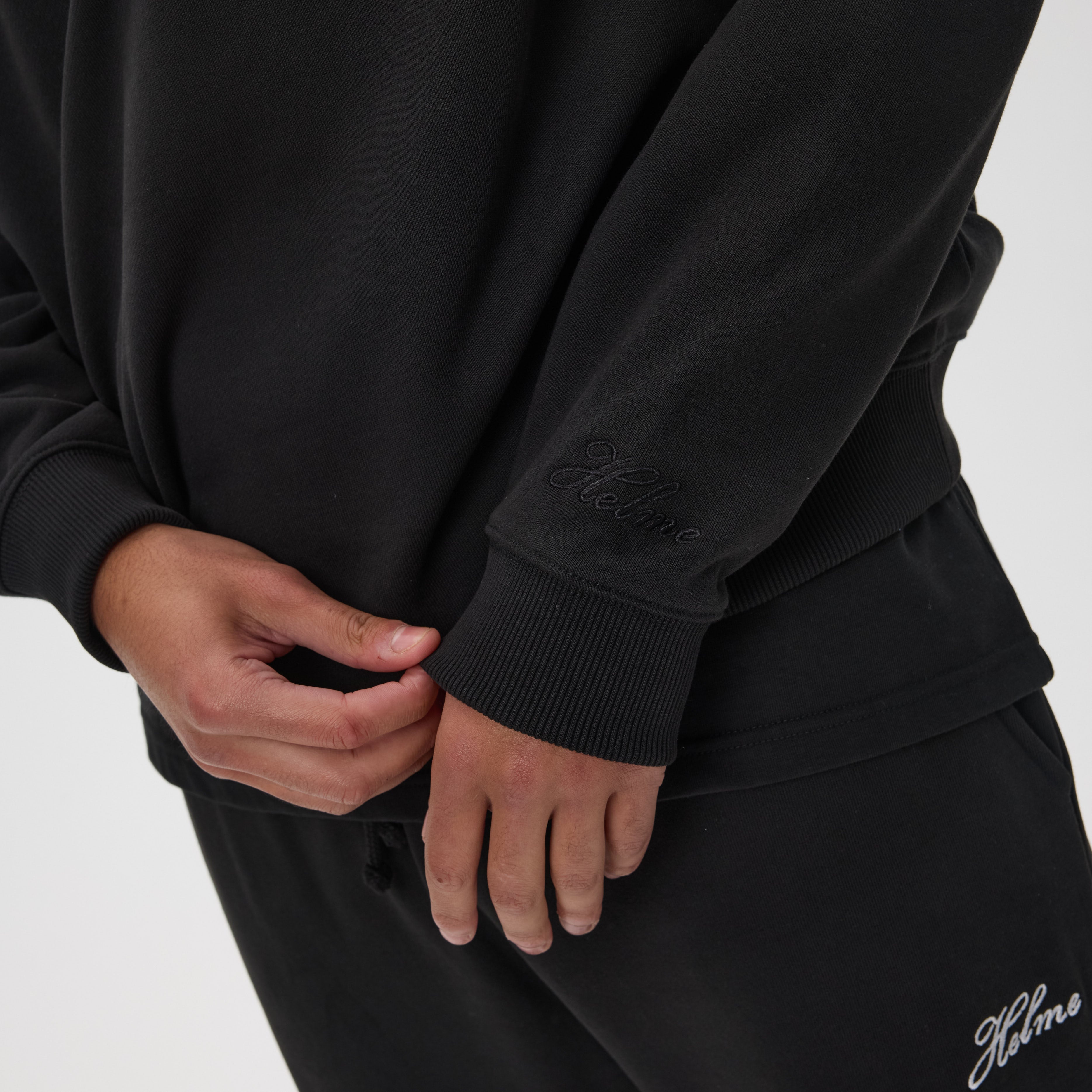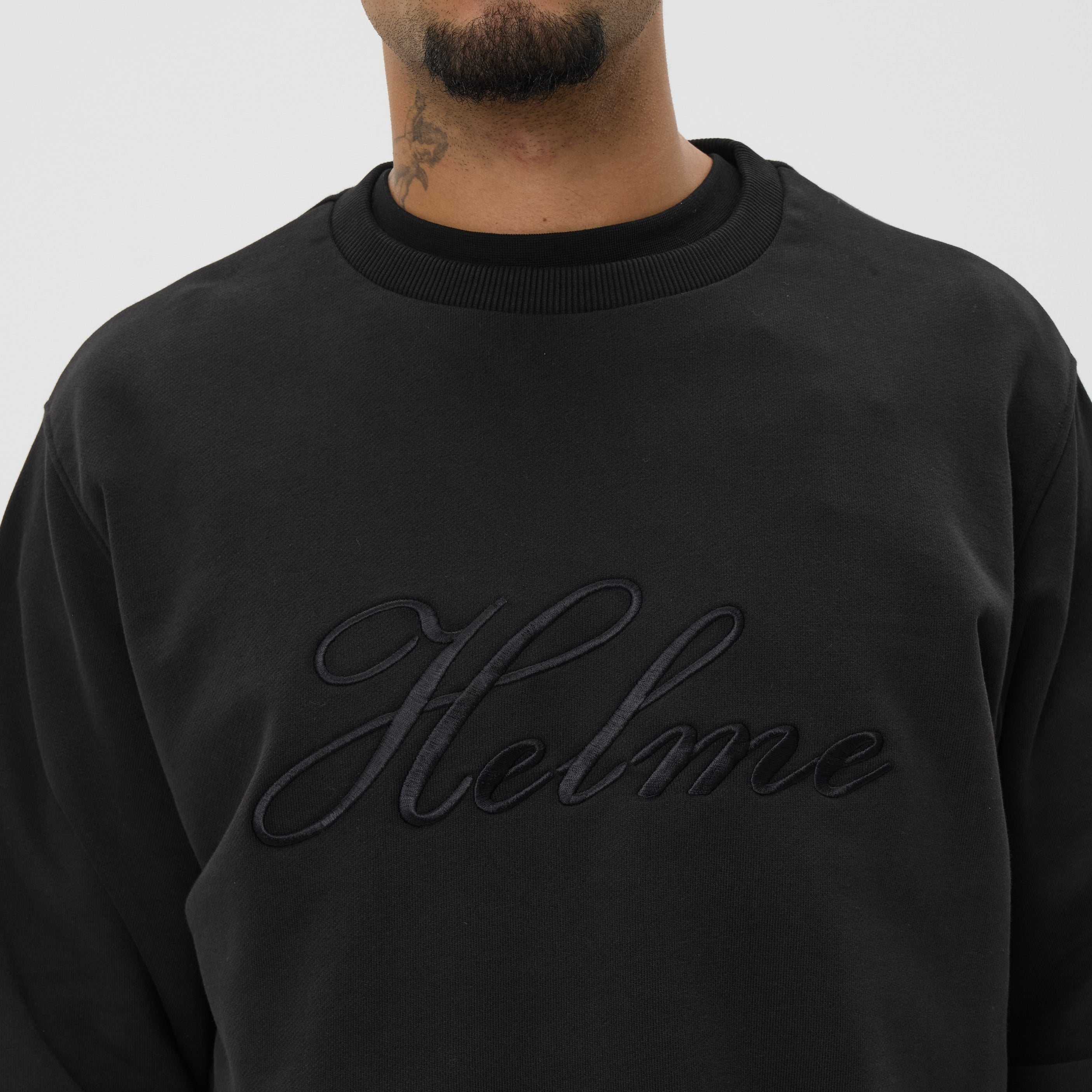 The standout feature is the large embroidered Helme logo across the front, complemented by a subtle embroidered detail on the sleeve. Ribbed cuffs, hem, and collar provide structure and a premium finish, making this sweatshirt a versatile statement piece in modern streetwear.