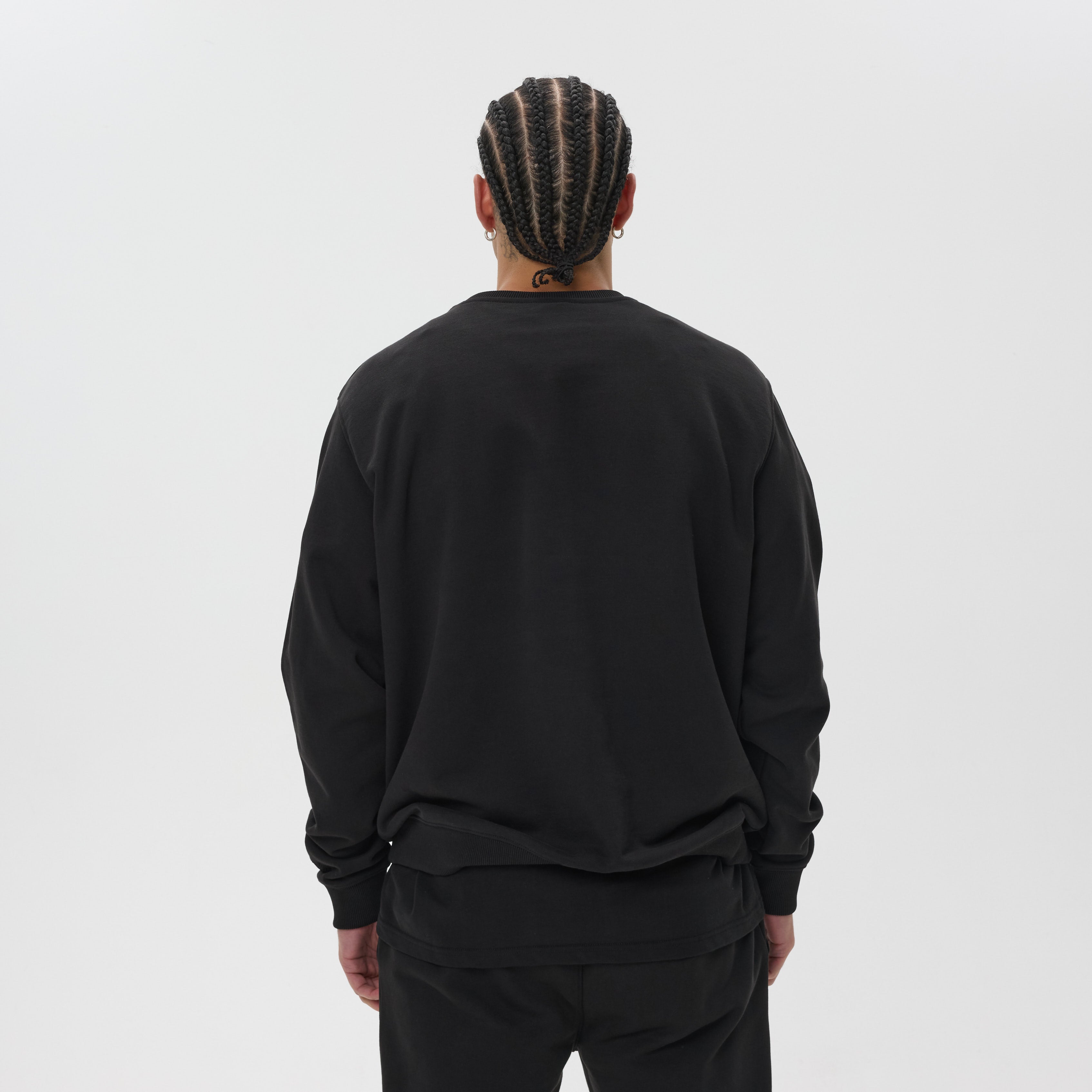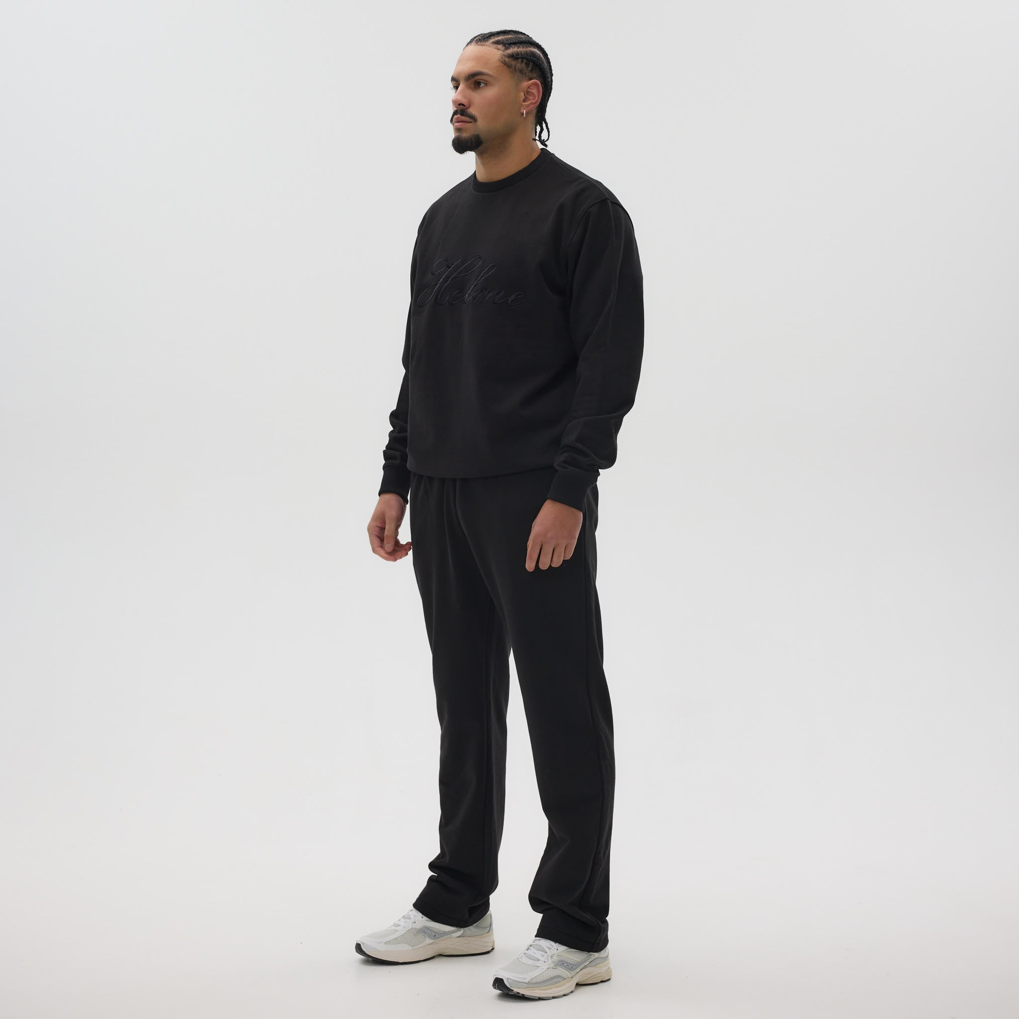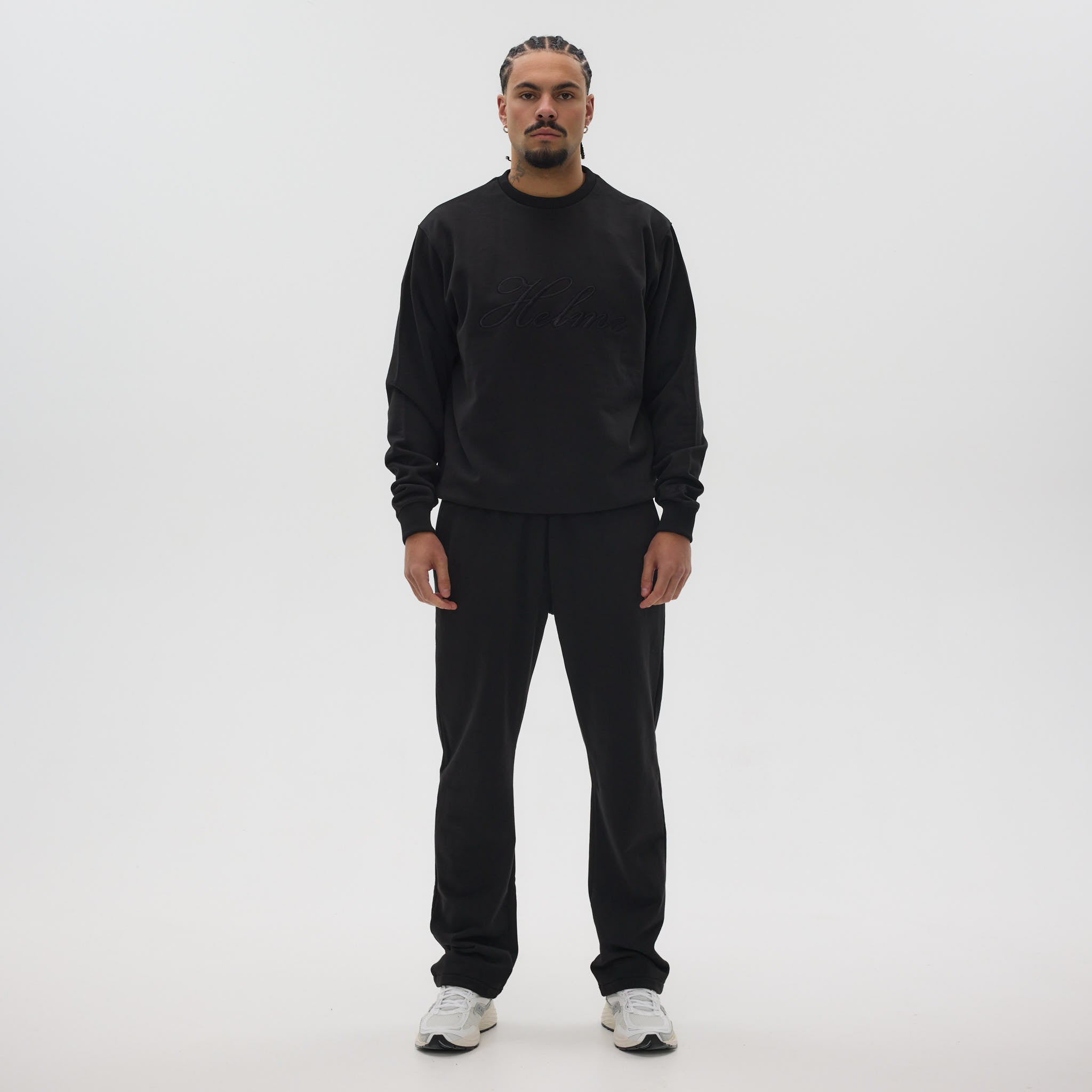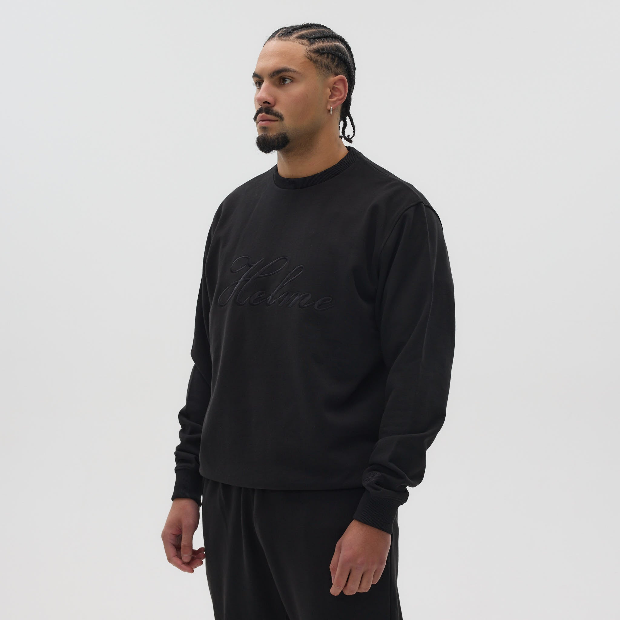 The standout feature is the large embroidered Helme logo across the front, complemented by a subtle embroidered detail on the sleeve. Ribbed cuffs, hem, and collar provide structure and a premium finish, making this sweatshirt a versatile statement piece in modern streetwear.